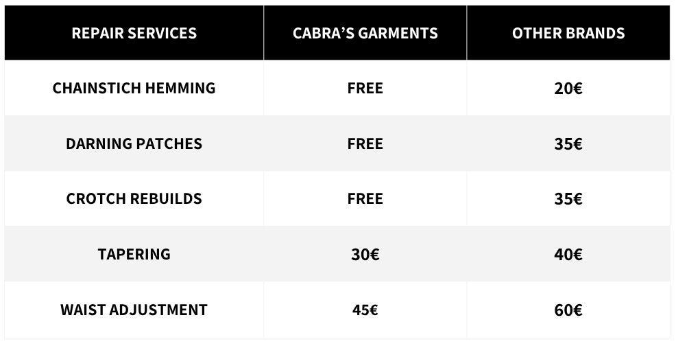- Payment: Required before any work starts. Free repairs apply only to Cabra’s jeans (not samples or if damage is deemed encouraged).