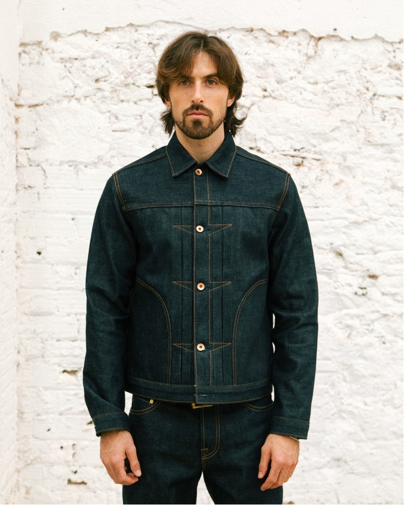 The jacket: A tribute to the earliest denim jackets of the 1910s, reinterpreted for today. We’ve preserved the iconic boxy silhouette and signature pleats, while introducing two side pockets - designed as true hand-resting warmers - and a discreet internal pocket for essentials. Durable by design, versatile in wear, this is our modern evolution of a workwear classic.